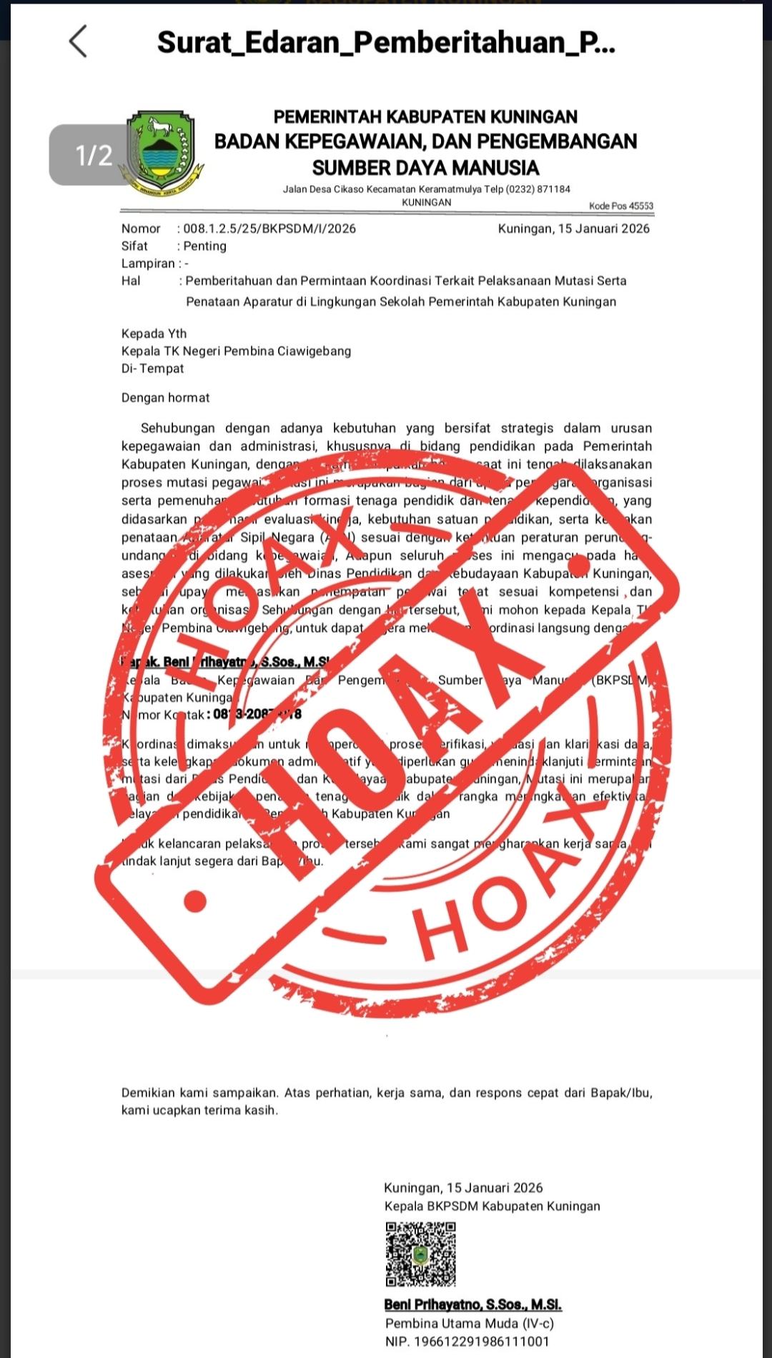 BKPSDM Kabupaten Kuningan mengimbau kepada seluruh kepala sekolah, tenaga pendidik, serta pihak terkait agar tidak menindaklanjuti isi surat tersebut dalam bentuk apa pun, mengingat informasi yang disampaikan merupakan hoaks dan berpotensi menimbulkan keresahan di lingkungan pendidikan.